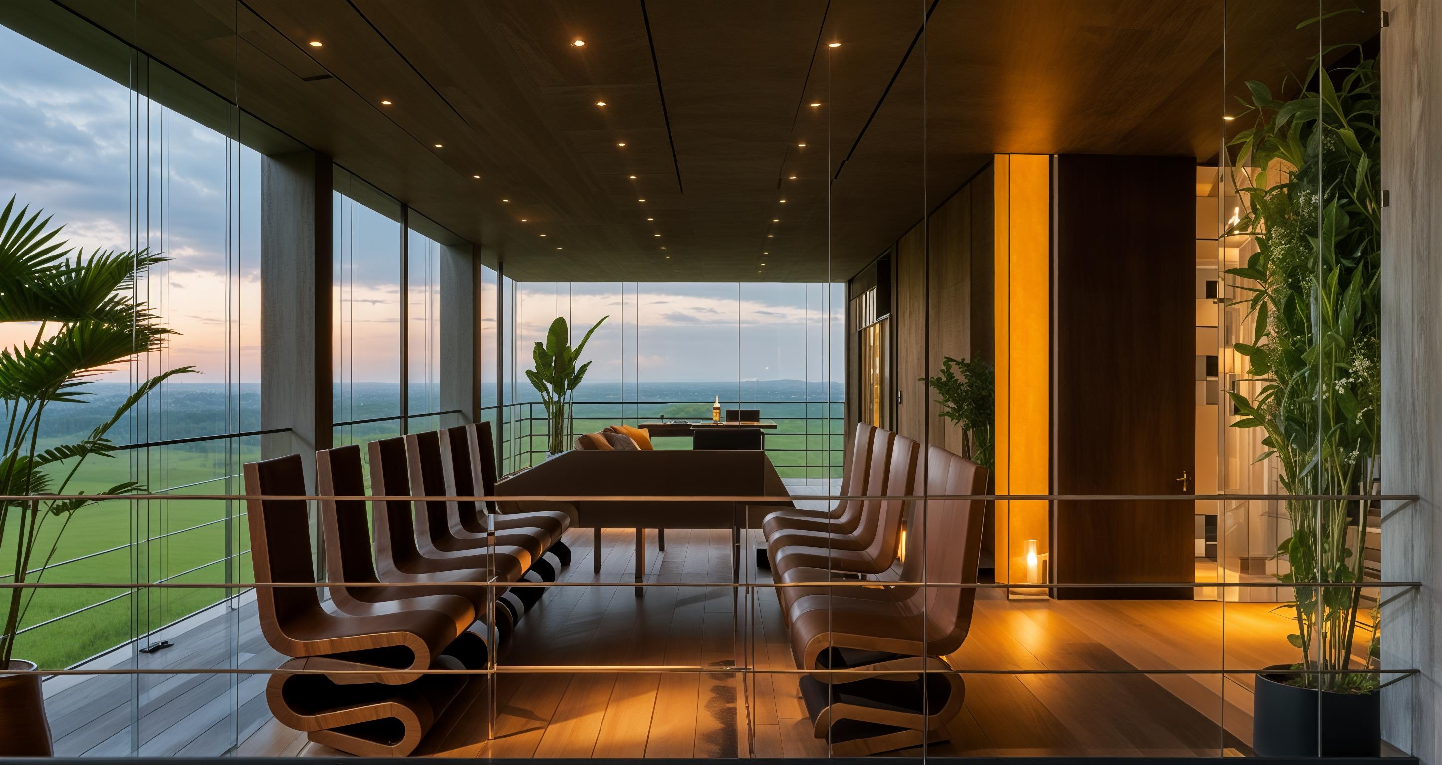 The building, set in a sweeping rolling hillscape that stretches as far as the eye can see, appears as a suspended, airy structure in harmony with the natural contours of the terrain. The skillful use of solid wood, glass, and corten steel establishes a continuous dialogue between the interior spaces and the surrounding environment, reflecting the principles of essentiality and contemplation central to the wabi-sabi philosophy.